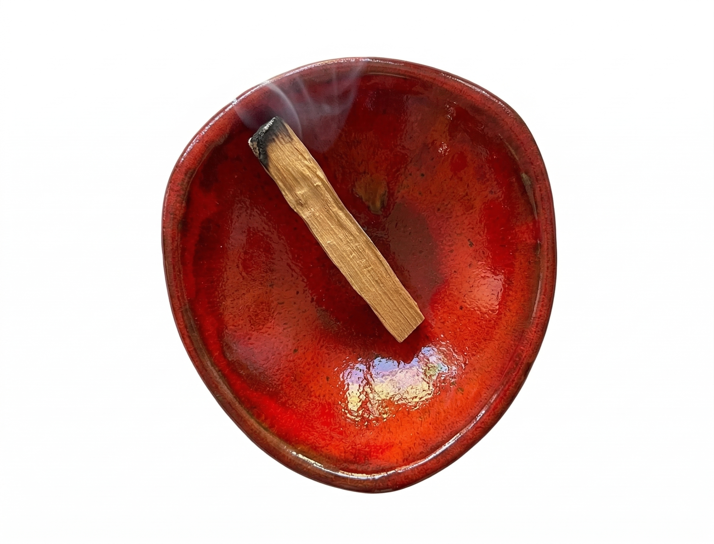 Palo santo stick smoking in a red ceramic bowl